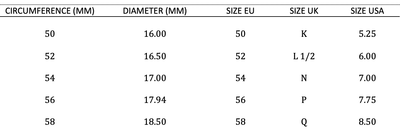 Another easy way to get your ring size, especially when you preparing a surprise, isto find existing ring and measure the inner diameter or immer circumference. Them multoply the value by 3.14 and the result corresponds to the ring size. If your existing ring is in between two sizes, we highly recommend sizing up. Ring sizing depends also on your country region, so feel free to use our internatiol ring size converter, if you know your size in another region.
